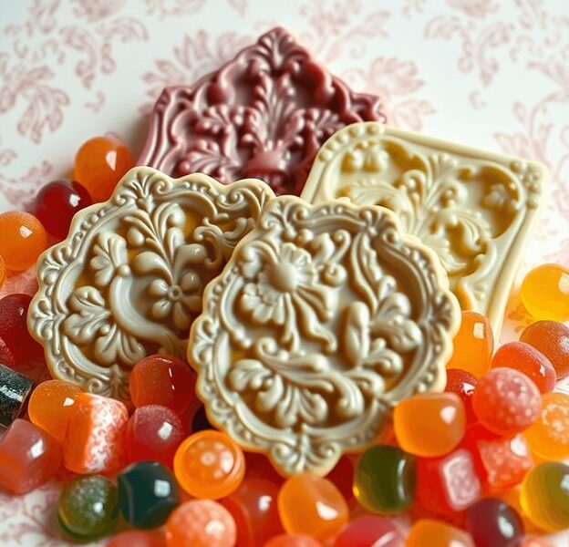 Victorian design principles transformed decorative candy molds into tiny masterpieces, showcasing the era’s love for intricate details and symbolism. These vintage mold designs often featured nature-inspired motifs and classical artistic influences, resulting in visually stunning sweets.